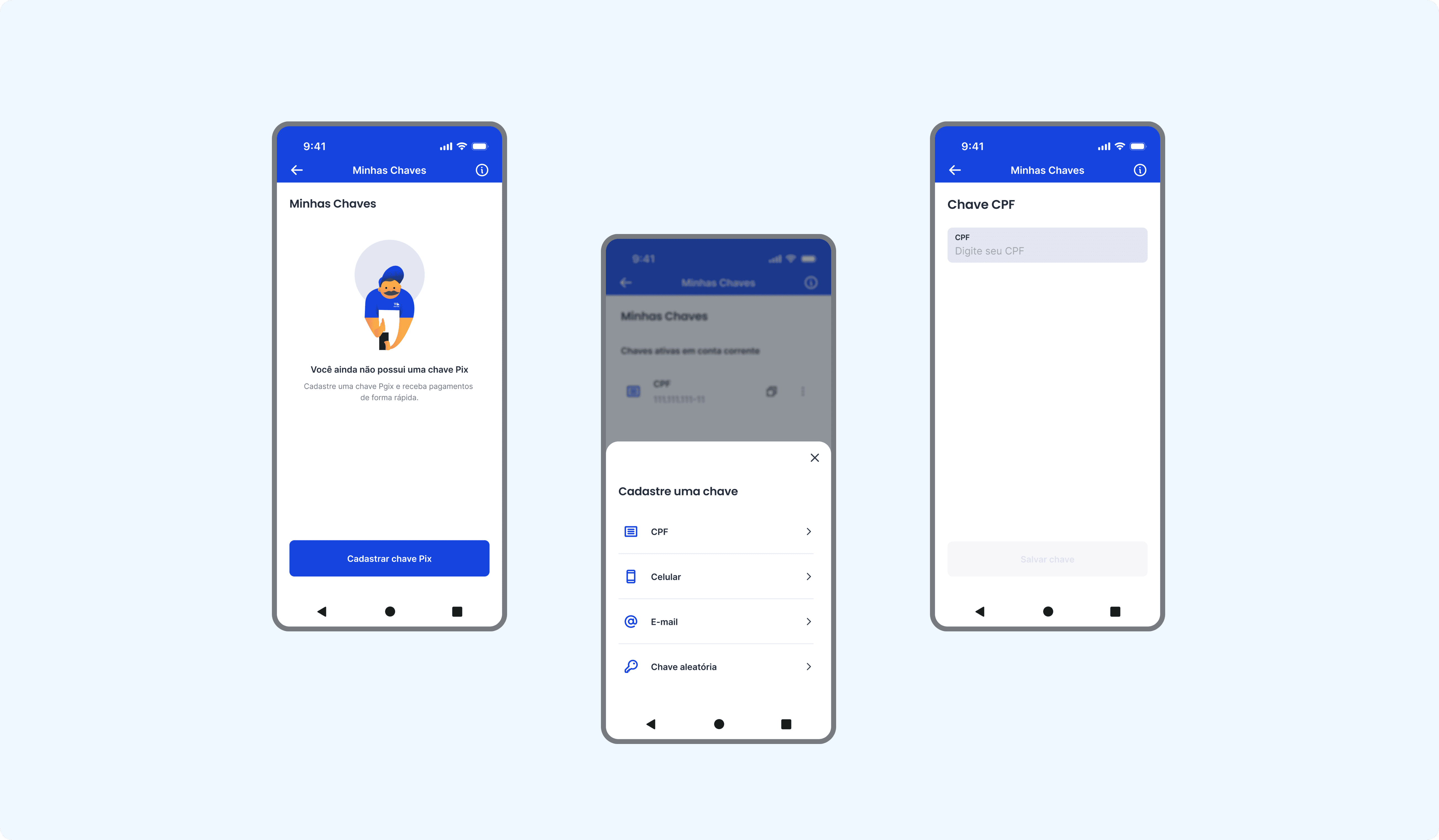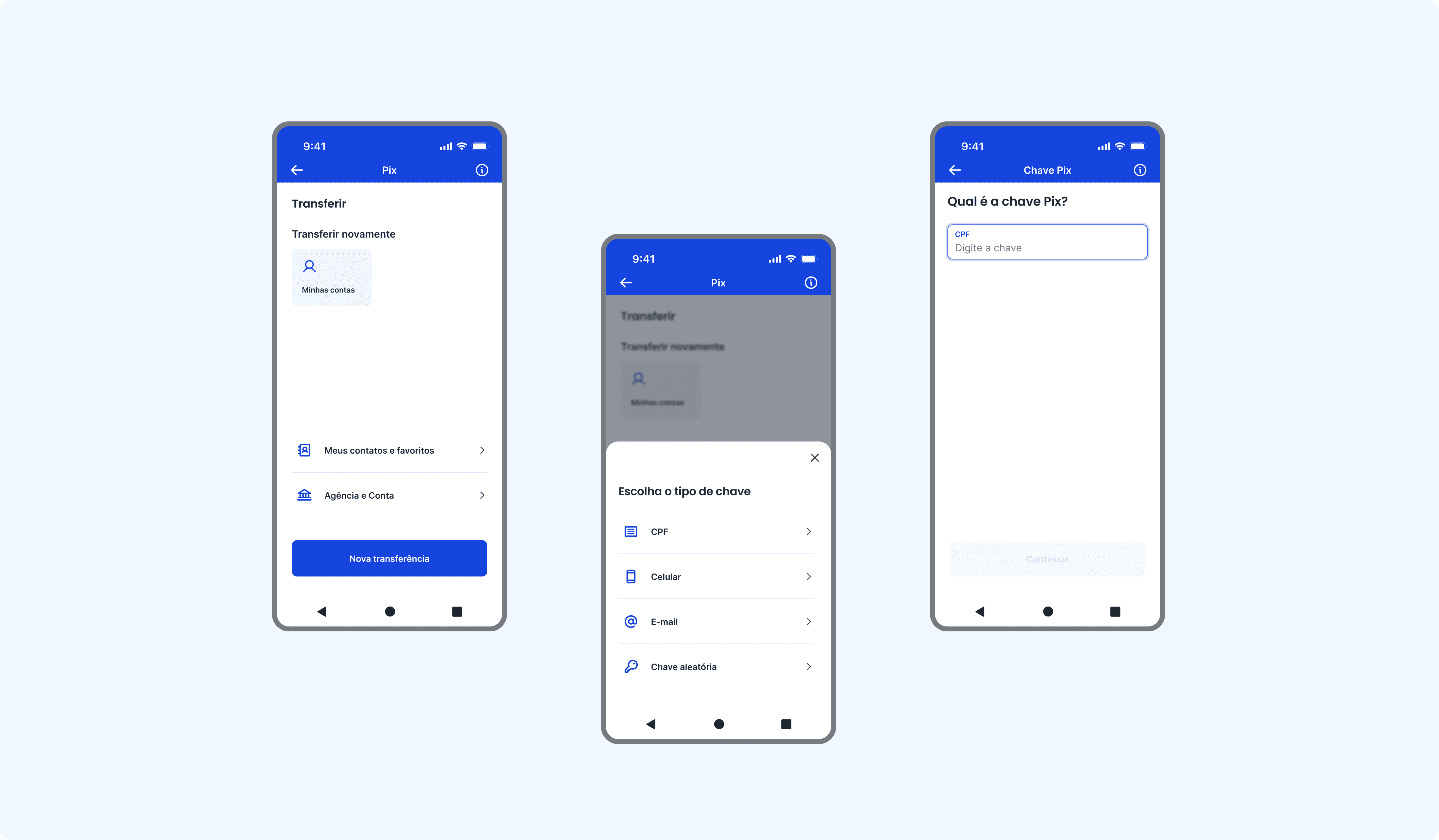 Na construção dos fluxos de Pix, busquei estruturar a experiência com foco em segurança, clareza e controle, considerando o caráter imediato e irreversível das transações financeiras.